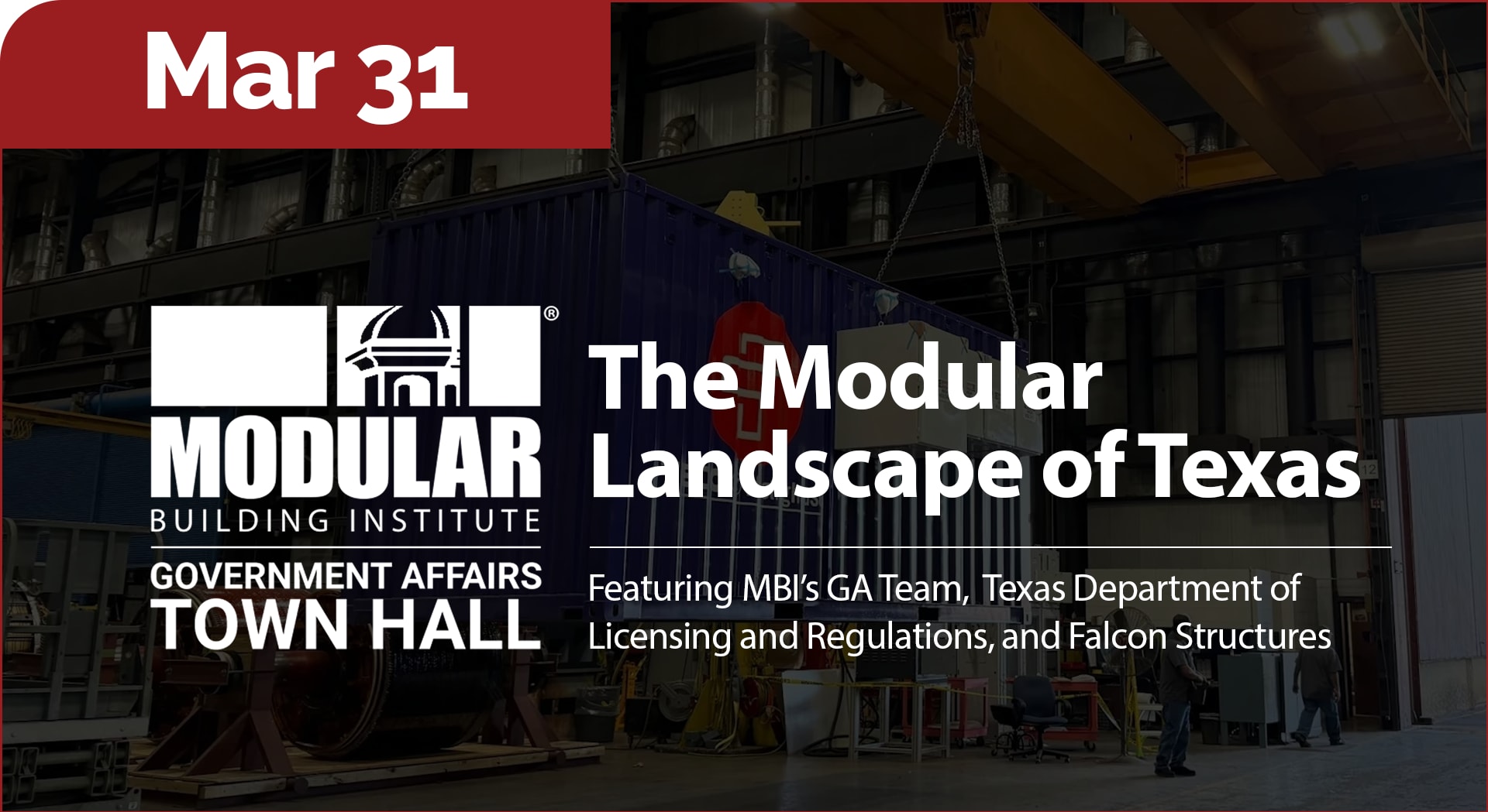 The Modular Building Institute is excited to announce a town hall event with TDLR at Falcon Structures on March 31 from 9:00 AM to 12:00 PM. Please join leadership and staff from MBI and TDLR as we provide updates on recent and upcoming policy changes, and to engage in constructive dialogue on the state of the modular industry in Texas and beyond. This in-person townhall is free for all MBI members.