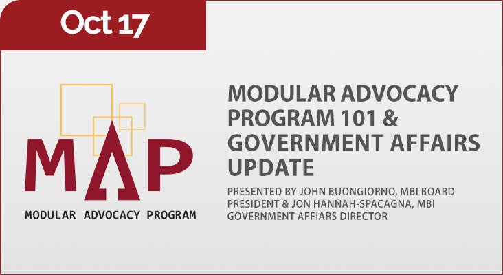 Join John Buongiorno, President of the Modular Building Institute, for this LIVE webinar. John will go over the basics of the Modular Advocacy Program and MBI's Government Affairs Director, Jon Hannah-Spacagna will also be giving a government affairs update.